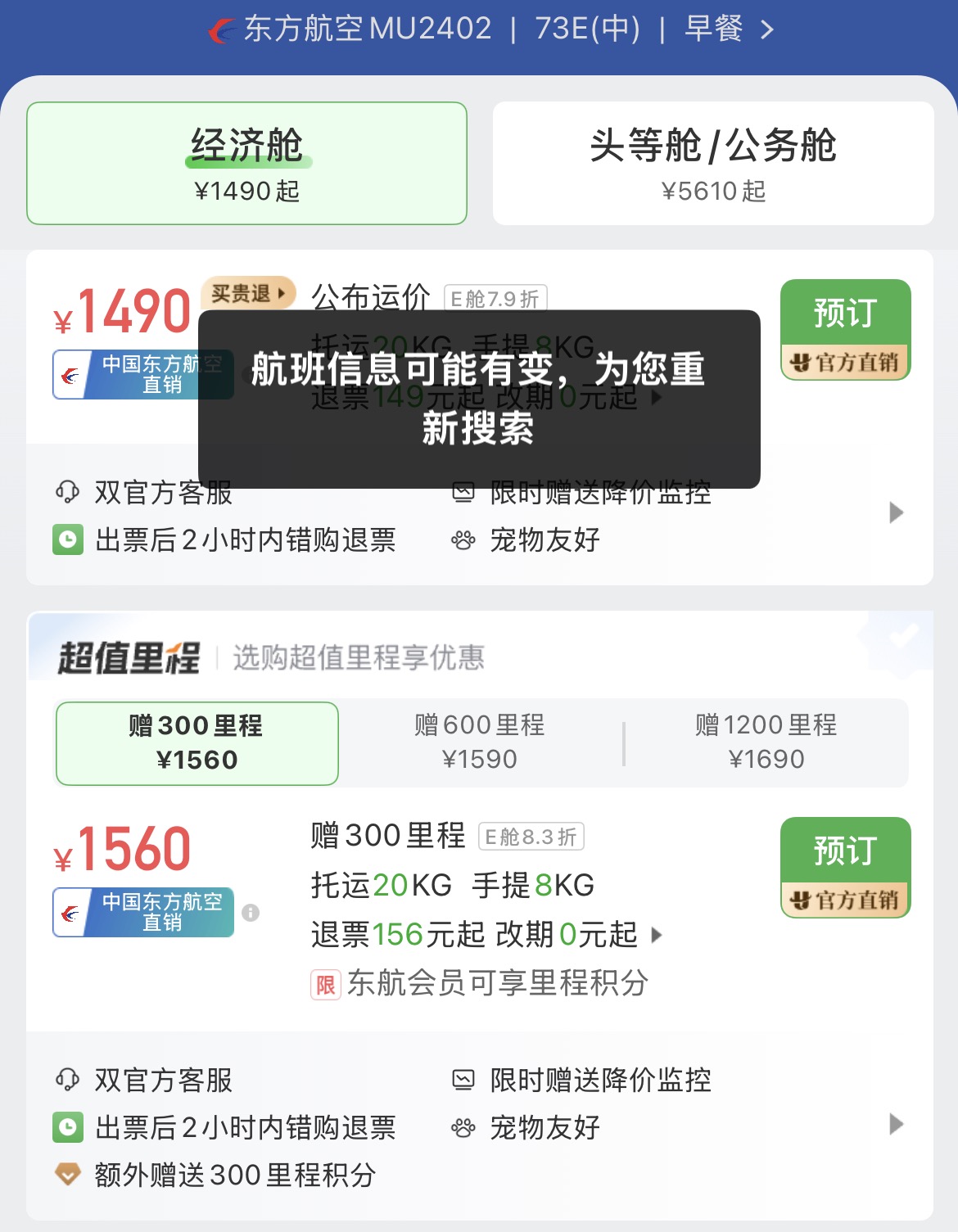 记者尝试机票预定,提交预定信息时,走漏“航班信息可能有变,为您再行搜索。”尝试几次后,仍无法完成机票预定。