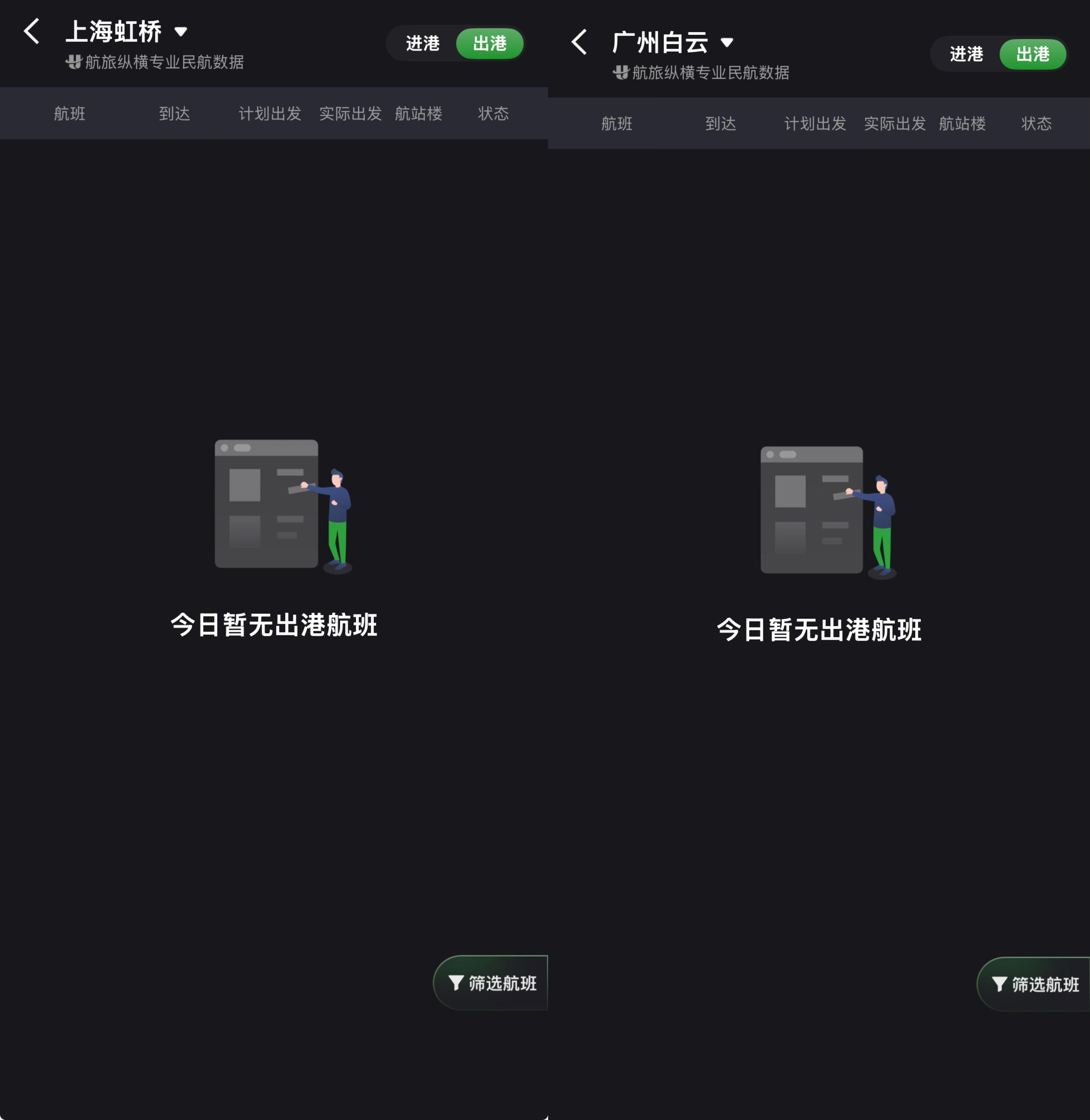 此外,通过航旅纵横查询上海虹桥机场、广州白云机场的进、出港情况,页面走漏“暂无航班”。